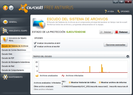 Cuenta con un escudo que analiza archivos, uno de correos electrónicos, escudos web, P2P, mensajería instantánea... Así como un escudo de Red y de Comportamiento, este ultimo se encarga de monitorizar las actividades de tu sistema, alertándote si hubiera algún comportamiento sospechoso.